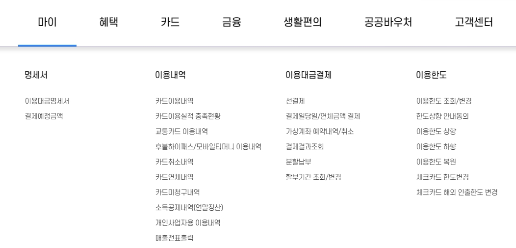 1. 메인 메뉴 구성이 깔끔하게 정리되어 있어 첫 화면에서 주요 서비스로 바로 이동할 수 있어요. 상단에는 카드 이용 내역 조회와 결제 예정 금액 확인 메뉴가 배치되어 있고, 아래에는 할인과 적립 혜택 안내가 구분되어 있어 원하는 정보를 빠르게 찾을 수 있습니다.