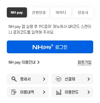 8. NH pay 서비스 메뉴에서는 QR 코드 스캔이나 간편 인증으로 빠른 결제가 가능해요. PC와 모바일 환경 어디서든 인증 후 결제 내역을 조회할 수 있어 온라인 쇼핑이나 외부 결제를 간편하게 관리할 수 있습니다.