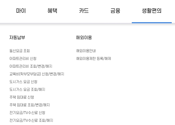 5. 생활 편의 서비스 메뉴에서는 아파트 관리비 조회, 도시가스와 통신 요금 납부 같은 일상 요금을 한곳에서 처리할 수 있어요. 외부 사이트 방문 없이 여러 공과금 결제를 바로 진행할 수 있어 편리함을 더해줍니다.