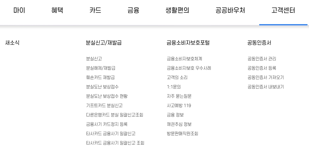7. 고객센터 메뉴에서는 금융 소비자 보호 안내와 함께 카드 분실 신고, 재발급 절차를 빠르게 진행할 수 있어요. 보상 접수 현황을 확인하고 상담원과 연결하는 기능도 있어 위급 상황에 신속하게 대응할 수 있습니다.