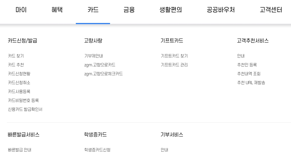 1. 메인 메뉴 구성이 깔끔하게 정리되어 있어 첫 화면에서 주요 서비스로 바로 이동할 수 있어요. 상단에는 카드 이용 내역 조회와 결제 예정 금액 확인 메뉴가 배치되어 있고, 아래에는 할인과 적립 혜택 안내가 구분되어 있어 원하는 정보를 빠르게 찾을 수 있습니다.