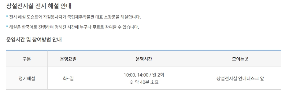혼자서 둘러보는 것도 좋지만, 전시품에 대한 재미있는 이야기를 들으면서 보면 더 기억에 남고 유익하겠죠. 국립제주박물관에서는 정기 해설 프로그램을 운영하고 있어요. 화요일부터 일요일까지, 하루에 두 번 진행되는데 오전 10시와 오후 2시에 시작해요. 해설을 듣는 데는 약 40분 정도 걸리고, 상설전시실 안내데스크 앞에서 모여서 출발하니 시간을 잘 맞춰서 가면 된답니다. 누구나 무료로 참여할 수 있으니 꼭 이용해보세요.
