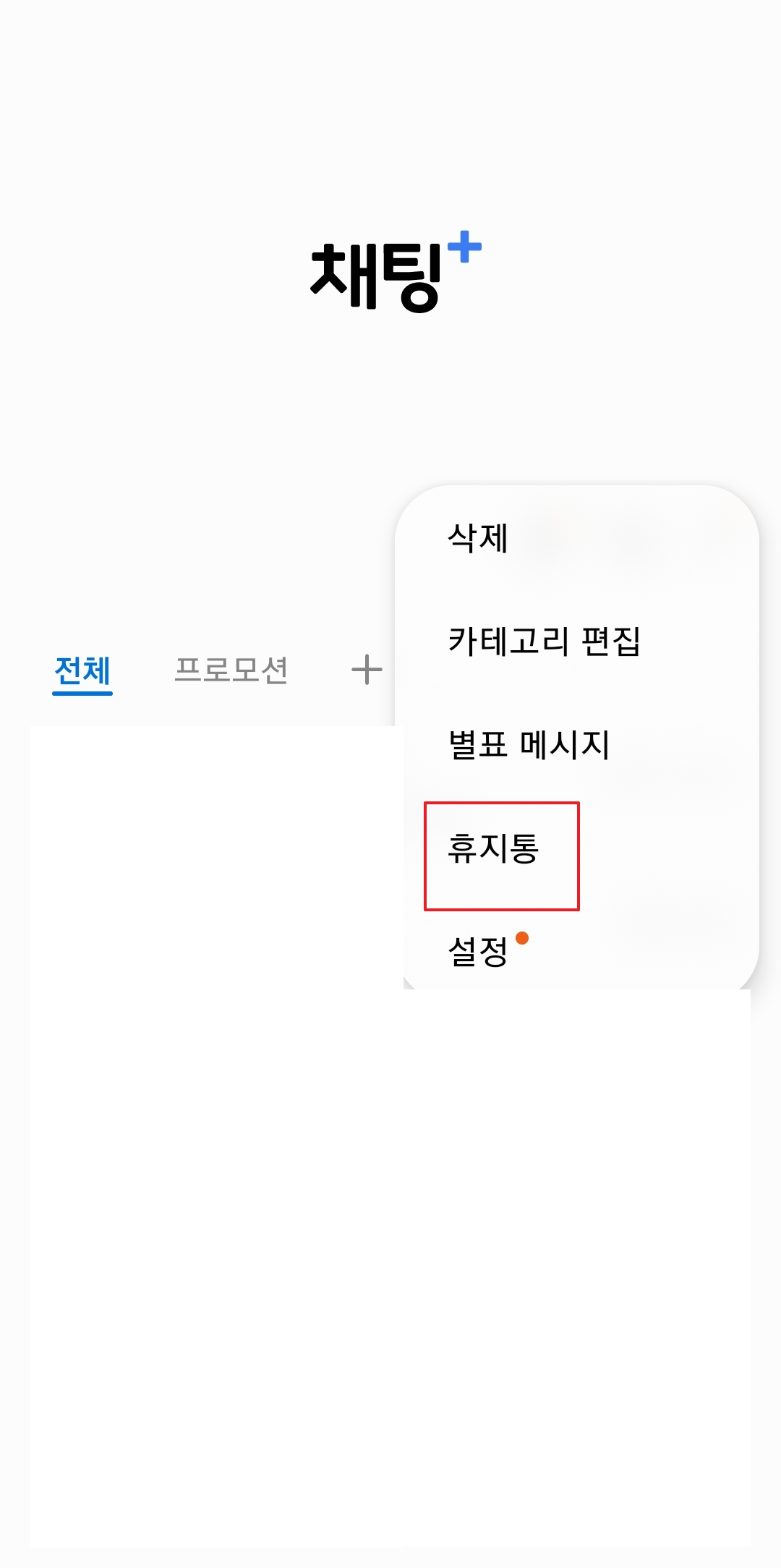 가장 먼저 문자 메시지 휴지통을 찾아볼게요. 우리가 매일 쓰는 문자 앱, 요즘은 이름이 채팅+ 라고도 불리더라구요. 이 앱을 열고 오른쪽 위에 보면 작은 점이 세 개 찍혀있는 버튼이 보일거에요. 그 버튼을 살짝 눌러주면 여러가지 메뉴가 나오는데, 그 중에서 '휴지통'이라고 쓰여진 글자를 찾아서 눌러주면 된답니다. 아주 간단하죠?