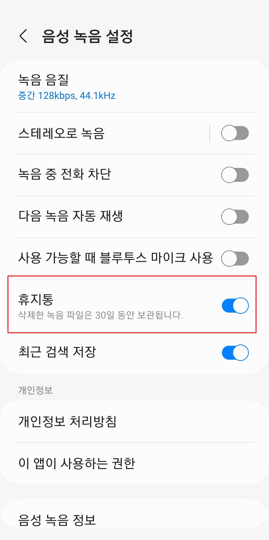 음성녹음 앱은 좀 더 친절하게도, 휴지통 기능이 꺼져있을 때 기능을 켜겠냐고 바로 물어보는 팝업창이 뜨기도 해요. 이럴 때는 당연히 '켜기' 버튼을 눌러주면 되겠죠? 기능을 켜고 나면 역시 설정 창에서 휴지통 기능이 파랗게 활성화된 것을 확인할 수 있구요. 음성녹음 파일도 다른 것들과 똑같이 30일 동안 휴지통에 안전하게 보관되니 안심하셔도 좋습니다.