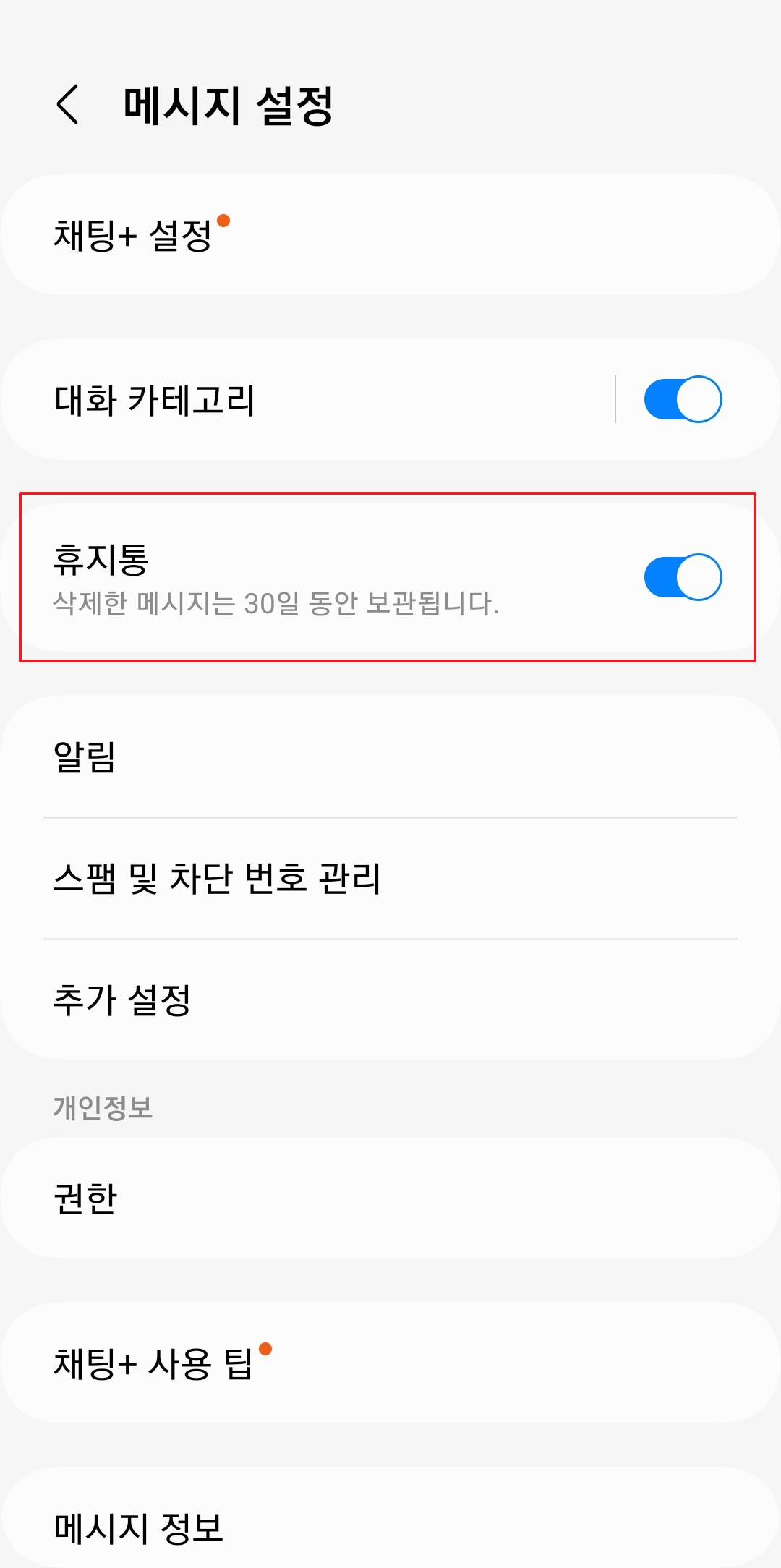 혹시 휴지통 메뉴를 눌렀는데 바로 안들어가진다면 기능이 꺼져있을 확률이 높아요. 그럴땐 당황하지 말고 설정으로 들어가서 휴지통 기능을 활성화 시켜주면 됩니다. 설정 메뉴에서 '휴지통' 항목을 찾아서 옆에 있는 버튼을 눌러주면 파란색으로 바뀌면서 기능이 켜지는 거에요. 이렇게 한번만 켜두면 다음부터는 지워진 문자들이 자동으로 휴지통으로 가게 되요.