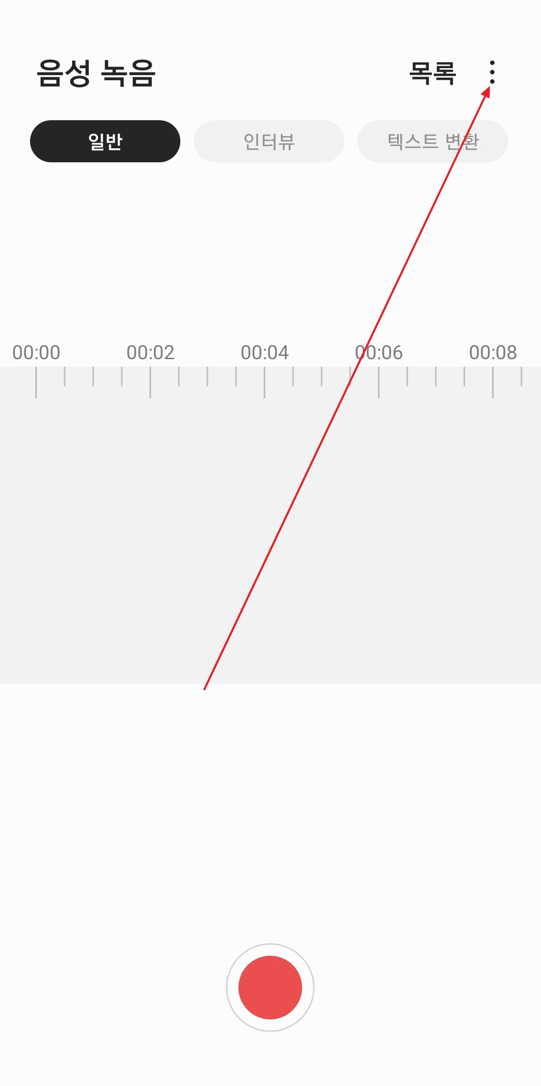 이번에는 중요한 회의 내용이나 강의를 녹음해두는 음성녹음 앱의 휴지통을 확인해볼게요. 음성녹음 앱을 실행하고 나면, 여기도 문자 앱처럼 오른쪽 위에 점 세 개 버튼이 보일거에요. 그 버튼을 누르면 메뉴가 나오는데, 익숙한 '휴지통' 글자를 찾아서 눌러주시면 됩니다. 앱마다 메뉴 버튼 위치나 모양이 조금씩 다르지만, 휴지통을 찾는 원리는 거의 비슷해서 이제는 쉽게 찾으실 수 있을거에요.