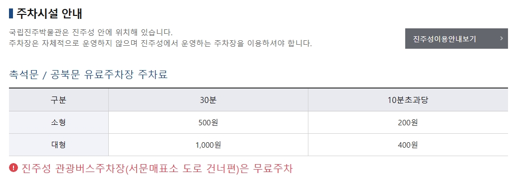 차를 가지고 가시는 분들을 위한 주차시설 안내입니다. 국립진주박물관은 자체적으로 운영하는 주차장이 따로 없어요. 그래서 진주성에서 운영하는 주차장을 이용해야만 합니다. 촉석문이나 공북문에 있는 유료주차장을 이용하면 되는데, 요금은 소형차 기준으로 최초 30분에 500원이고 이후 10분마다 200원씩 추가됩니다. 대형차는 최초 30분에 1,000원, 이후 10분마다 400원이 추가되니 주차 시간에 따라 요금이 달라진다는 점을 기억해야겠어요. 다행히도 진주성 관광버스주차장, 그러니까 서문 매표소 길 건너편에 있는 주차장은 무료로 이용할 수 있다고 하니, 버스로 단체 관람을 왔을 경우에는 아주 유용할 것 같네요.