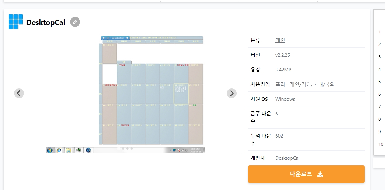 검색을 정상적으로 마쳤다면, 화면에 우리가 찾던 바탕화면 달력 프로그램이 나타날 거에요. 이름이랑 간단한 설명을 확인하고 맞다면, 망설이지 말고 바로 클릭해서 프로그램에 대한 더 자세한 정보가 있는 페이지로 들어가주세요. 이 프로그램은 바탕화면을 지저분하게 만들지 않으면서 달력을 띄워주기 때문에 많은 사람들이 좋아하고 꾸준히 사용하고 있는 아주 유용한 프로그램이에요.