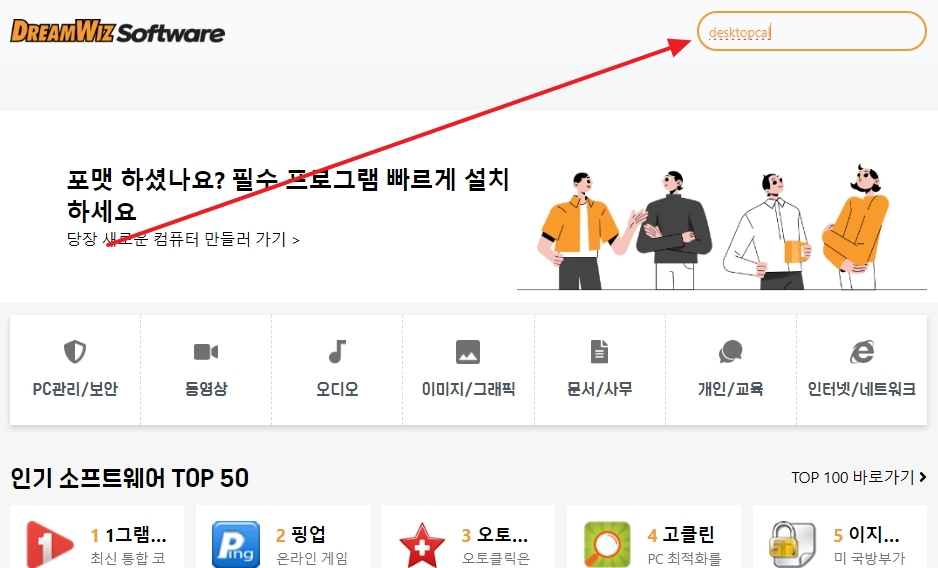 홈페이지에 들어갔다면 이제 우리가 원하는 프로그램을 찾아볼 차례에요. 화면의 오른쪽 위를 잘 살펴보면 돋보기 모양으로 생긴 검색 버튼이 보일 거에요. 그 버튼을 누르면 검색어를 입력할 수 있는 작은 창이 나타나는데, 거기에 desktopcal(데스크탑칼) 이라고 정확하게 입력하고 검색을 해주세요. 영어로 입력해야 하니까 오타가 나지 않도록 조심해서 입력하는게 중요하답니다.
