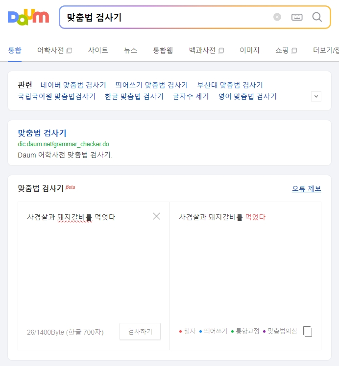 이번에는 다른 곳이죠. 다음(Daum)이라는 사이트에서도 똑같이 한번 맞춤법 검사를 해봤어요. 왜냐하면 사이트마다 조금씩 결과가 다를 수도 있거든요. 그래서 비교해보면 더 정확하게 알 수 있으니까요. 같은 문장을 넣고 어떻게 다른지 한번 살펴보는 것도 좋은 방법이에요.