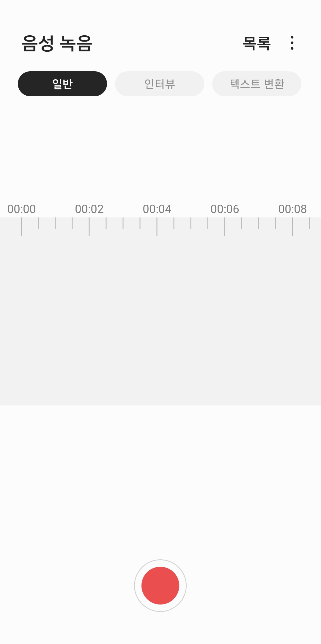 음성 녹음 어플을 실행하면 화면에 몇 가지 선택지가 나타나는데요. 바로 일반, 인터뷰, 텍스트 변환 이렇게 세 가지의 녹음 방식이 준비되어 있습니다.