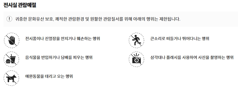 또한, 음식물을 가지고 들어가거나 담배를 피우는 행위는 당연히 금지되어 있습니다. 반려동물과 함께 들어갈 수도 없으니 이 점도 기억해주세요. 마지막으로 사진을 찍을 때 삼각대나 플래시를 사용하는 것은 유물을 손상시킬 수 있기 때문에 금지하고 있으니, 조용히 눈과 마음에 담아가는 것이 가장 좋겠습니다.