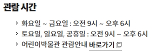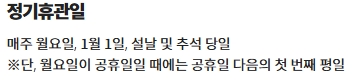 그런데 한 가지 알아둬야 할 점이 있어요. 만약에 월요일이 공휴일과 겹치는 경우에는 월요일에 정상적으로 문을 열고, 그 다음 첫 번째 평일에 대신 문을 닫는다고 하네요. 이런 점을 미리 확인하지 않으면 모처럼 시간을 내서 갔는데 허탕을 칠 수도 있으니 꼭 기억해두세요.