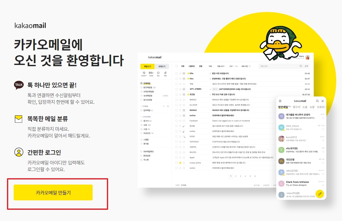 다음 홈페이지를 통하지 않고, 카카오 메일 홈페이지로 바로 들어가서 만드는 방법도 있답니다. 이 방법은 카카오톡이랑 더 직접적으로 연결되는 느낌을 주는데요. 화면에 보이는 것처럼 '카카오메일 만들기' 버튼을 누르고 카카오 계정으로 로그인만 하면 바로 이메일이 만들어지기도 합니다. 카카오 서비스를 주로 이용하는 분들에게는 이 방법이 더 편할 수도 있겠네요.