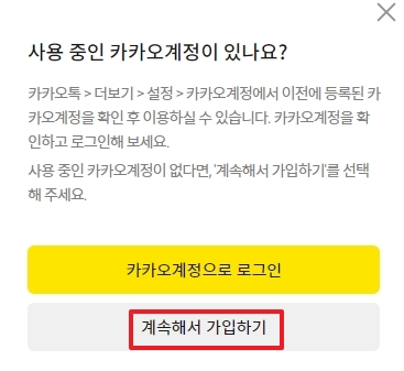 회원가입을 누르면 이런 화면이 나올텐데요. 요즘은 카카오랑 다음이 합쳐져서 카카오 계정 하나로 다 이용할 수 있게 되어있어요. 그래서 만약에 원래 쓰던 카카오 계정이 있다면 그걸로 바로 시작할 수 있고요. 그게 아니라 '나는 완전히 새로운 이메일을 만들고 싶어!' 하면 아래에 있는 '새로운 카카오계정 만들기'를 선택하면 된답니다. 뭘 선택할지는 본인이 편한 쪽으로 고르면 돼요.