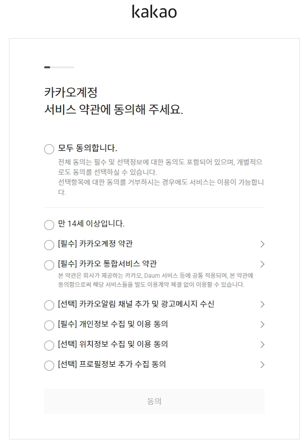 이제 회원가입을 위한 약관 동의 화면이 나타나요. 여러 항목들이 있어서 복잡해 보일 수 있지만, 자세히 보면 [필수]라고 표시된 것과 [선택]이라고 표시된 것으로 나뉘어 있어요. 모든 서비스에 가입할 때 그렇듯이, 필수 항목에만 동의를 해도 계정을 만드는 데는 전혀 지장이 없답니다. 선택 항목은 보통 광고나 마케팅 정보 수신에 관한 내용이니, 원하지 않으시면 굳이 동의하지 않으셔도 괜찮습니다.