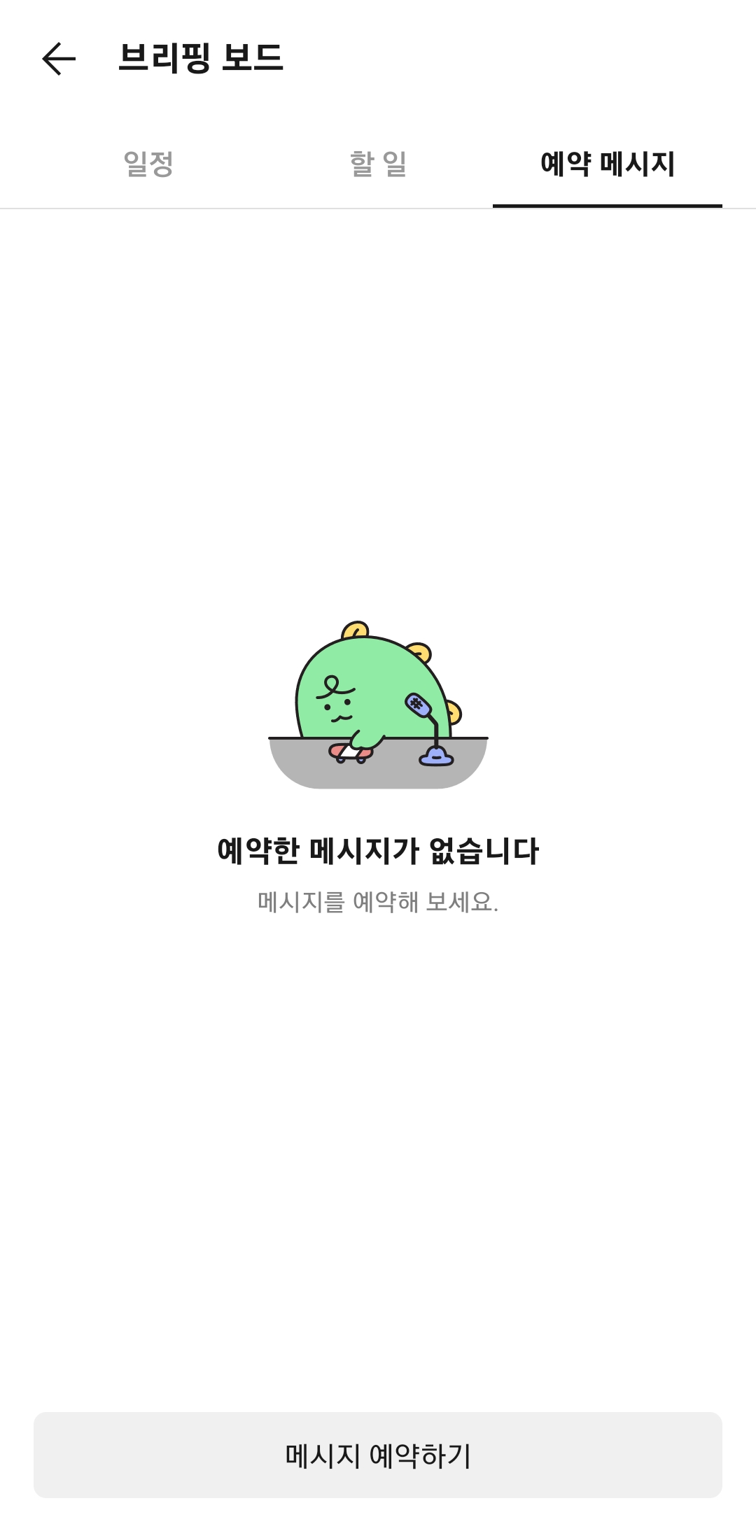 모든 설정을 마치고 '등록하기'를 누르면 예약이 완료됩니다. 그런데 내가 예약을 제대로 한 건지, 어떤 내용을 예약했는지 궁금할 때가 있잖아요. 그럴 때는 '예약 목록 보기'를 눌러보면 됩니다. 이곳을 누르면 '브리핑 보드'라는 곳으로 이동하는데, 내가 예약한 메시지 목록을 한눈에 확인할 수 있습니다.