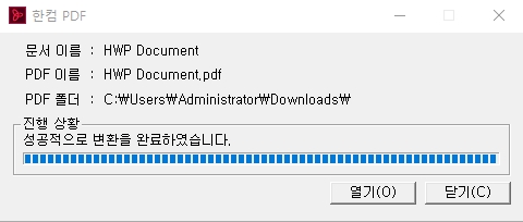 문서가 길지 않다면 정말 눈 깜짝할 사이에 끝나고, '성공적으로 변환을 완료하였습니다' 라는 메시지가 뜰 거에요. 이제 '열기'를 눌러서 바로 확인하거나 '닫기'를 누르고 직접 폴더로 찾아가봐도 됩니다.