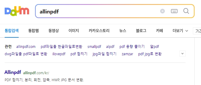 이번에는 반대로 pdf 파일을 한글 파일로 바꿔볼 거에요. 이건 한글 프로그램 안에서는 할 수 없고, 인터넷의 도움이 필요하답니다. 인터넷 검색창에 'allinpdf'라고 검색해서 나오는 웹사이트로 들어가주세요.