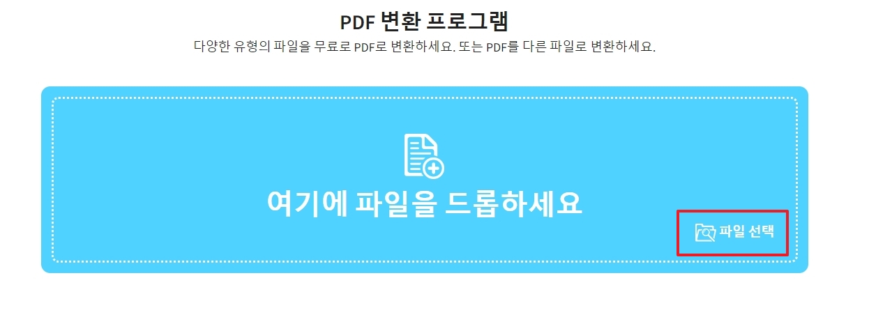 다음 화면으로 넘어가면 '여기에 파일 놓기' 라고 쓰인 커다란 공간이 보일 거에요. 여기에다가 내가 바꾸고 싶은 pdf 파일을 마우스로 끌어다가 그냥 툭 놓아주면 됩니다.