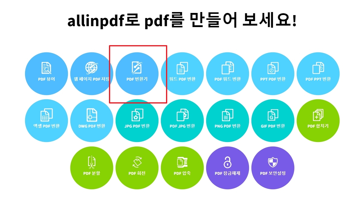 사이트에 들어가면 여러가지 네모난 메뉴들이 보일텐데요. 우리는 파일을 변환할 거니까 'pdf 변환기' 또는 영어로 'pdf converter' 라고 써 있는 메뉴를 찾아서 클릭하면 됩니다.