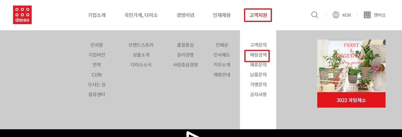 고객지원에 마우스를 올리거나 클릭하면 아래로 작은 메뉴들이 더 나오는데, 거기서 매장검색을 눌러주면 됩니다. 여기에서 전국의 모든 다이소 매장 정보를 찾아볼 수 있답니다.