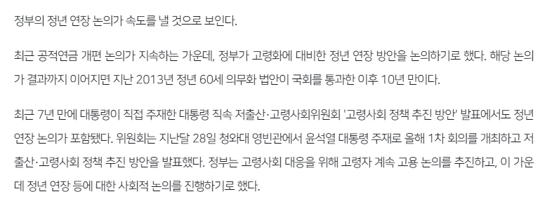 기사 내용을 살펴보면, 2013년 정년 60세가 의무화된 이후 약 10년 만에 다시금 정년 연장 논의가 본격적으로 시작되었음을 알 수 있습니다. 이는 단순히 오래 일하는 문제를 넘어, 공적연금 개편이라는 사회 전체의 과제와 깊이 연관되어 있음을 보여줍니다. 저출산 고령화라는 시대적 흐름 속에서 피할 수 없는 변화입니다.