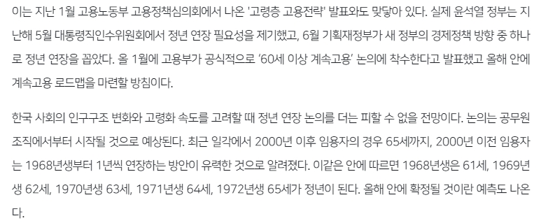 이러한 논의는 국민연금 수급 개시 연령과 맞추어 진행되고 있습니다. 국민연금을 받기 시작하는 나이는 점차 늦춰져 2033년부터는 65세가 됩니다. 퇴직 후 연금을 받기까지 소득이 없는 기간이 발생하는 것을 막기 위해, 정년 역시 이에 맞춰 조정하려는 것입니다. 정부는 연말까지 구체적인 실행 계획을 담은 로드맵을 마련할 계획입니다.