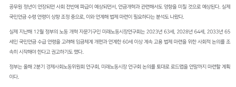 이러한 논의는 국민연금 수급 개시 연령과 맞추어 진행되고 있습니다. 국민연금을 받기 시작하는 나이는 점차 늦춰져 2033년부터는 65세가 됩니다. 퇴직 후 연금을 받기까지 소득이 없는 기간이 발생하는 것을 막기 위해, 정년 역시 이에 맞춰 조정하려는 것입니다. 정부는 연말까지 구체적인 실행 계획을 담은 로드맵을 마련할 계획입니다.