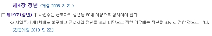 법률을 검색하면 해당 법의 상세 조항들을 확인할 수 있습니다. 수많은 조항 중에서 우리가 주목해야 할 부분은 바로 '정년'에 관한 내용입니다. 화면을 아래로 내려 관련 조항을 찾아보면, 현재 법이 정한 최소한의 정년 기준을 정확하게 알 수 있습니다. 이것이 모든 논의의 출발점입니다.
