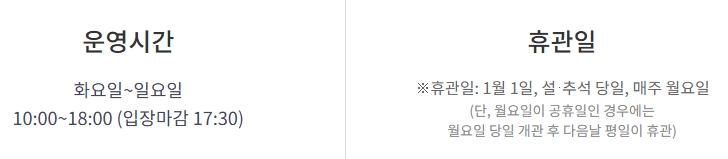 그리고 매주 월요일은 쉬는 날이니까 꼭 기억해두셔야 해요. 월요일 말고도 1월 1일, 설날하고 추석 당일에도 문을 닫는다고 하네요. 그런데 만약에 월요일이 공휴일이랑 겹치면 그 날은 열고, 그 다음 평일에 쉰다고 하니 방문 전에 미리 확인해보는 것이 좋겠어요.