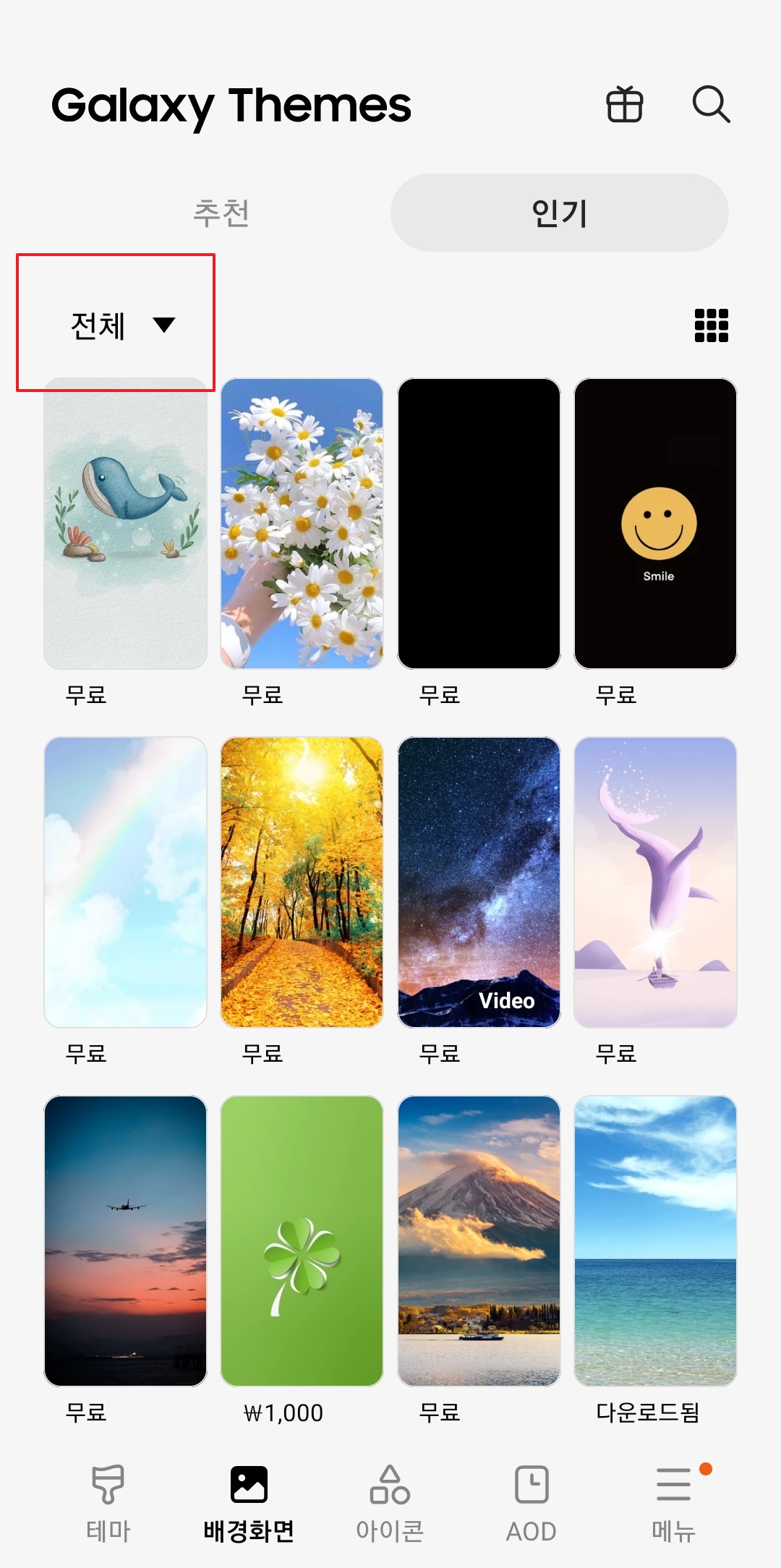 마음에 드는 배경화면을 찾았다면 이제 적용할 차례입니다. 하지만 유료 이미지도 함께 표시될 수 있으니, 반드시 좌측 상단의 '전체' 필터를 눌러 '무료'로 변경해 주세요. 이렇게 하면 비용 부담 없이 고품질의 멋진 배경화면들만 골라서 마음껏 다운로드하고 설정할 수 있습니다. 이제 원하는 이미지를 골라 나만의 개성 있는 스마트폰 화면을 완성해 보세요.