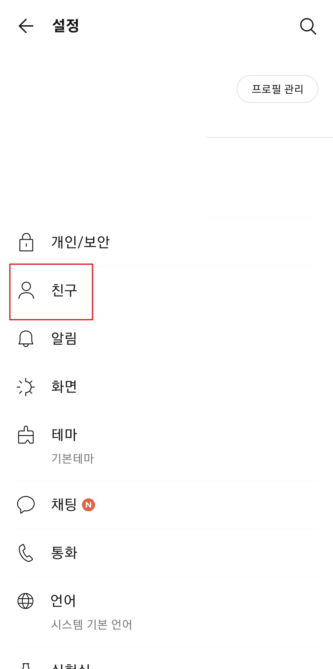설정 화면으로 들어오면 여러 메뉴가 보이는데, 그중에서 '친구' 항목을 선택합니다. 친구 관리와 관련된 다양한 옵션들이 이 메뉴 안에 모두 포함되어 있습니다.