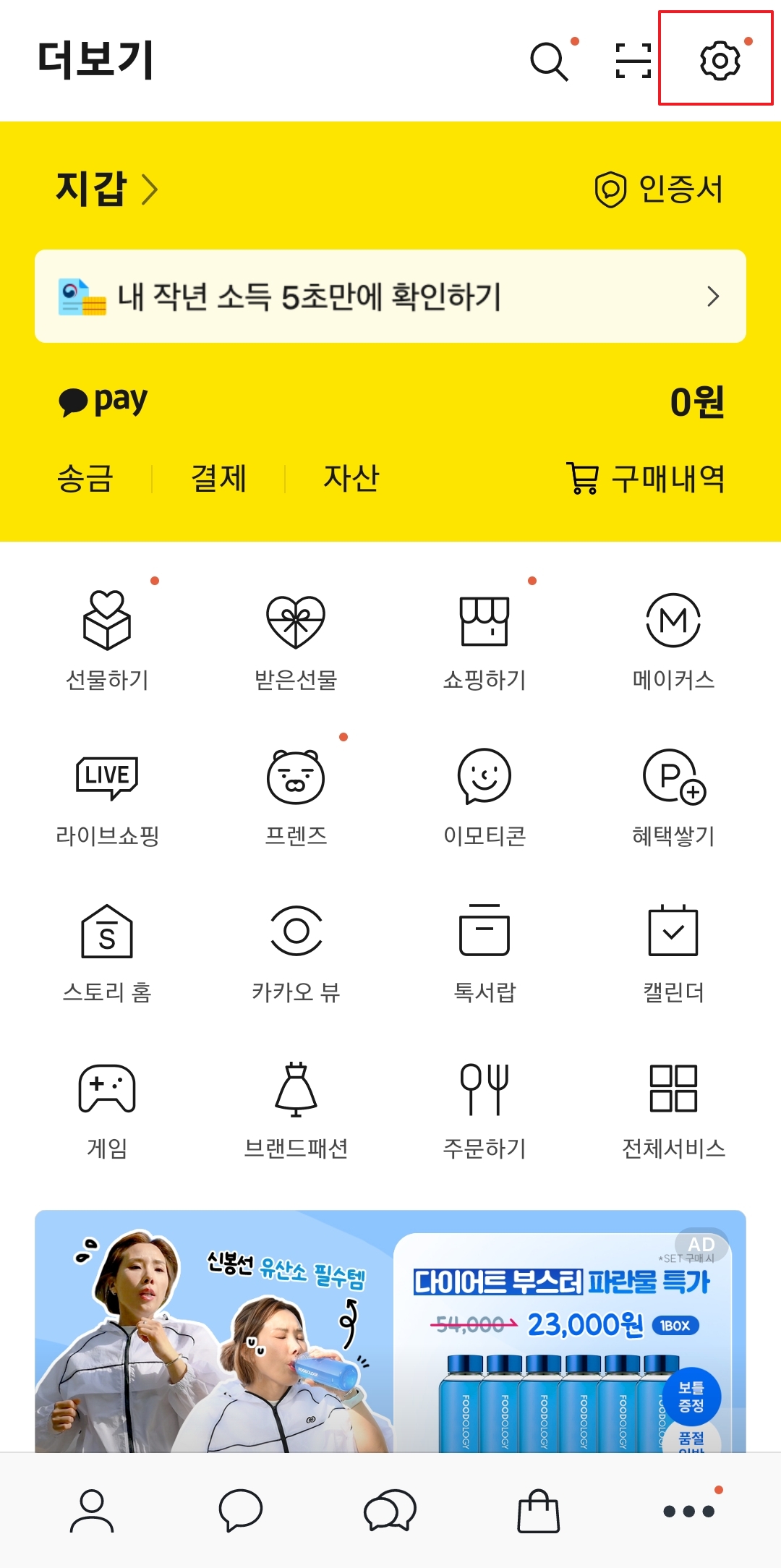 연락처 저장이 끝났다면 이제 카카오톡 앱을 열 차례입니다. 카카오톡 실행 후, 화면 오른쪽 아래에 있는 점 세 개(...) 모양의 '더보기' 탭을 선택하세요. 그러면 프로필 정보와 함께 다양한 메뉴가 나타납니다.